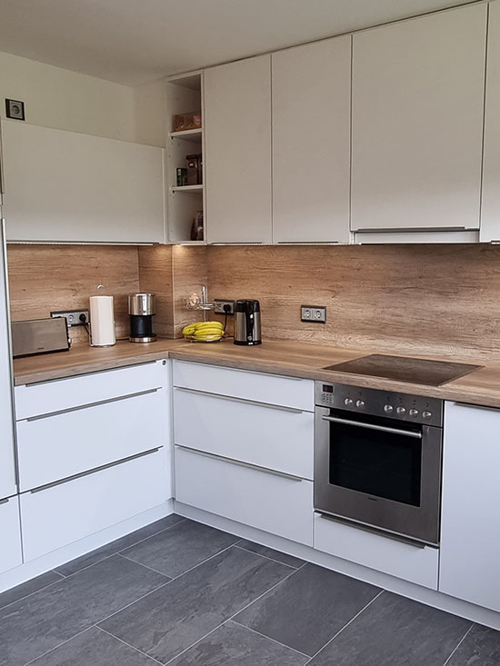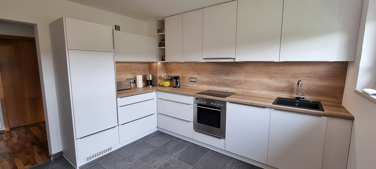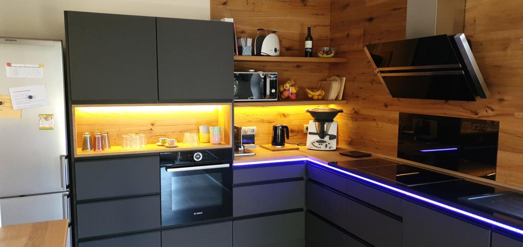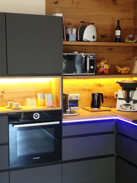 Auch besondere Wünsche wie integrierte Beleuchtung, LED-Elemente oder maßgefertigte Arbeitsplatten realisieren wir gerne, um Ihre Küche nicht nur funktional, sondern auch ästhetisch ansprechend zu gestalten. Durch unsere Erfahrung im Küchenbau nach Maß entstehen Räume, die durch Qualität, Komfort und Langlebigkeit überzeugen.